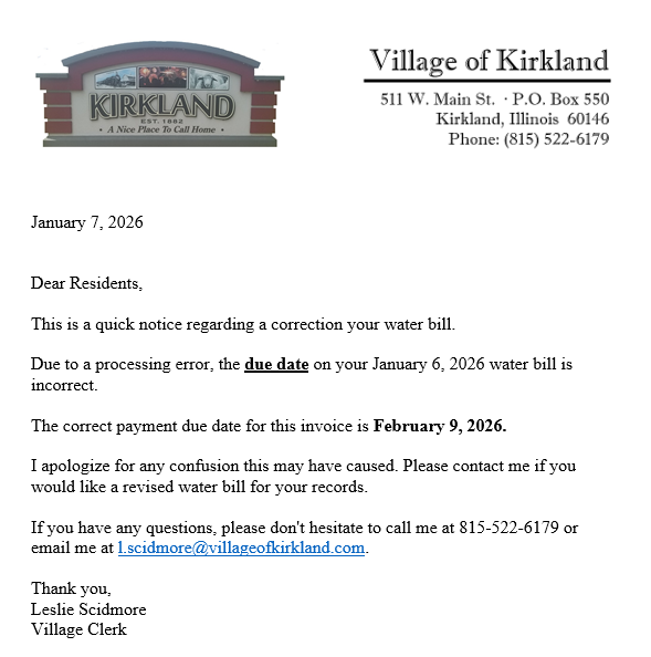 Correction to Water Bill Due Date